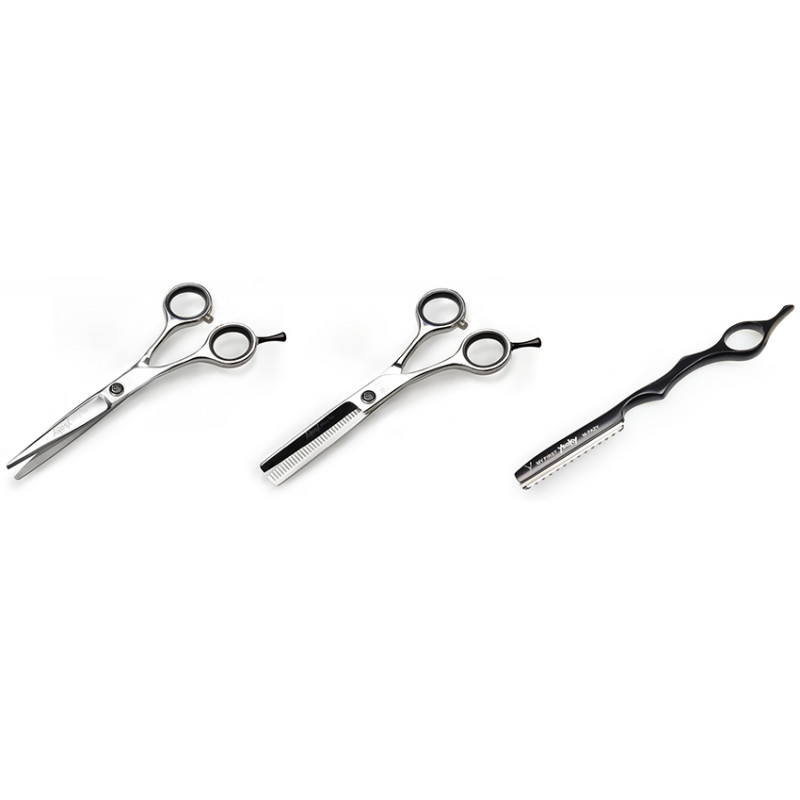 Comprenant un ciseau de coupe 55 MFY55LCC un scissors sculpteur 55 MFY55LTC un rasoir Fazy, 10 lames Fazy, huile, Regul-vis, tissu de nettoyage